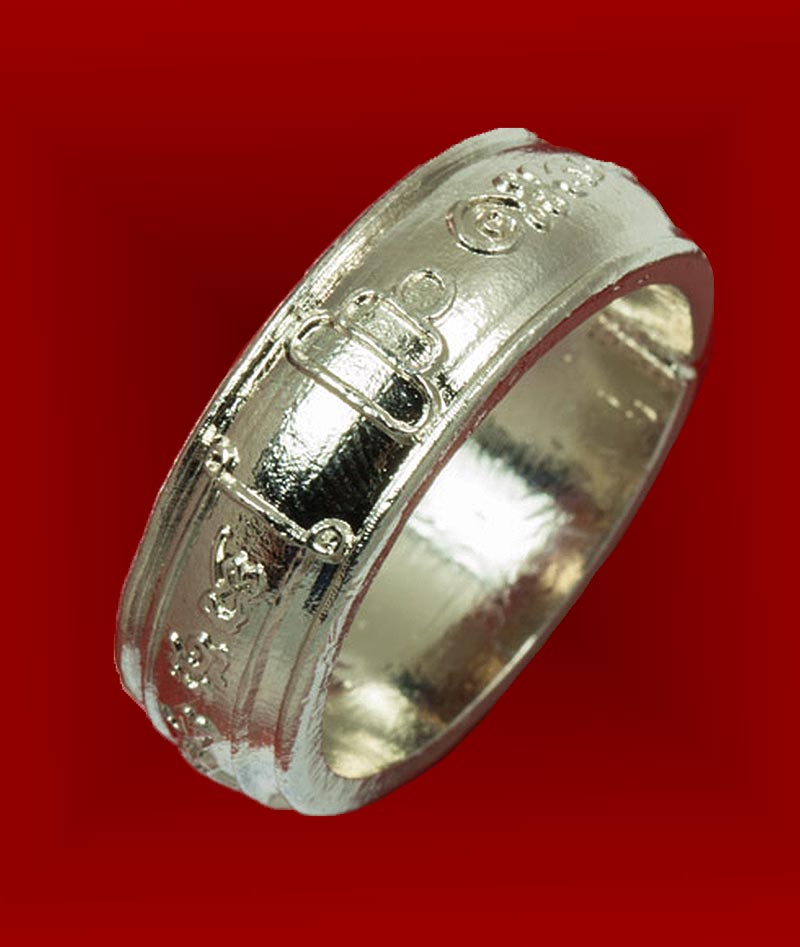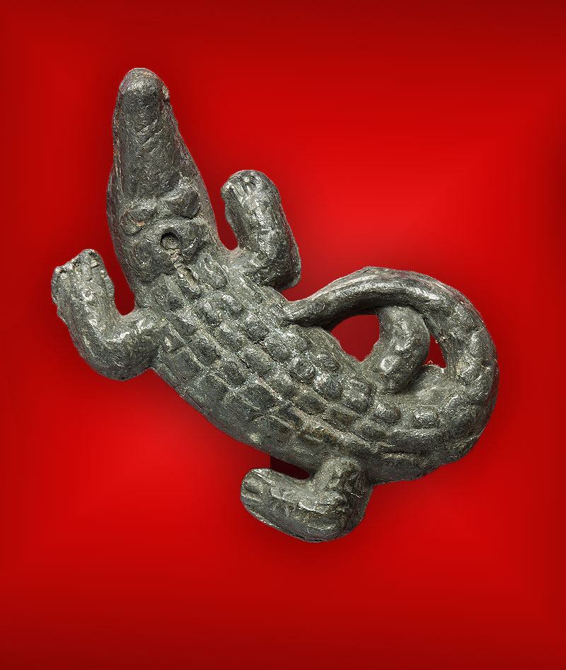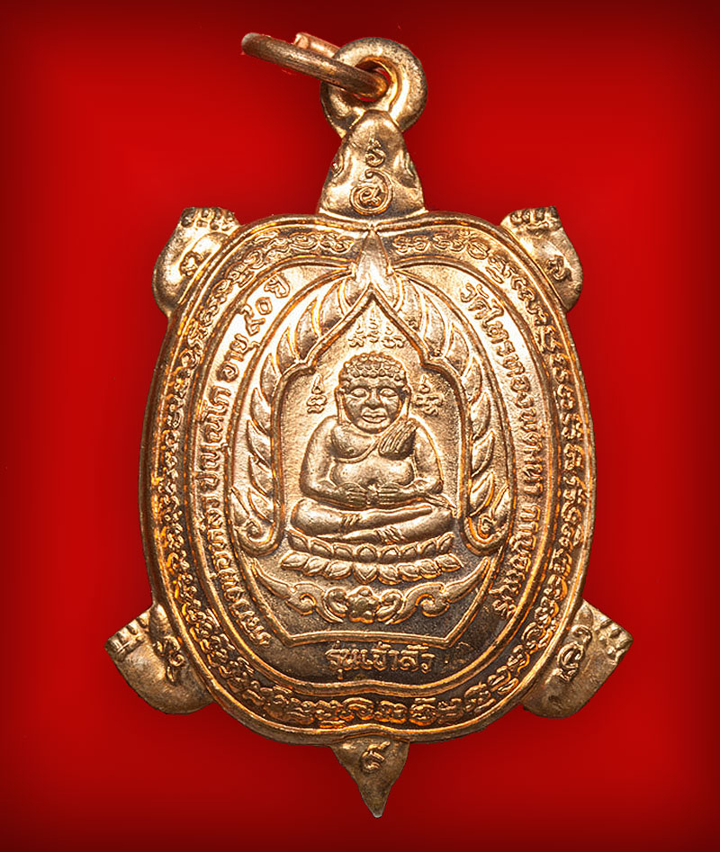 สิงห์หน้ามังกร หลวงพ่อหอม ทรงมหาดไทย ตาฝังพลอยสีแดง พิมพ์สามขวัญ ปี 2518 วัดชากหมาก จ.ระยอง (ขนาดกว้าง 2.0 ซม. )