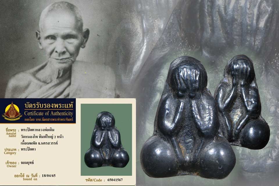 พระปิดตาสอดตะกรุดทองคำ เงิน พิมพ์จิ๋ว เนื้อผงพุทธคุณ สร้าง ปี พ.ศ. 2529 หลวงพ่อคูณ วัดบ้านไร่ สร้างน้อยหายาก แถวงมใบประกาศพระแท้จาก T-Amulet ตลับทองหลังปิด 10.88g 88.68% 迷你小娃娃必达 放金银符管 富大贵圣粉 佛历2529年/公历1986年 龙婆坤 瓦办莱寺 发行量极少 附有T-Almlet1鉴定书 封背开关金壳 金量10.88g 88.68% 善长的功效: 人缘 平安避险